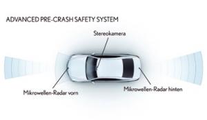 3. Pre-crash Brake Assist ในกรณีที่มีการตัดสินว่ากำลังเกิดบัติเหตุ การกดเบรก 1 ครั้ง ณ วินาทีนั้น ไม่ว่าจะกดเบรกเบา หรือ หนักระบบจะตัดสินให้เป็นการกดเบรกอย่างรุนแรง และสั่งให้ระบบเสริมแรงเบรก (Brake Assist) ซึ่งปกติจะทำงานเมื่อ กดเบรกอย่าง รวดเร็วและแรงเบรกไม่เพียงพอเท่านั้น แต่ในระบบ Pre-crash จะทำงานทันที เพื่อหลีกเลี่ยงการเกิดอุบิติเหตุ หรือ ลดความรุนแรงจากการชน